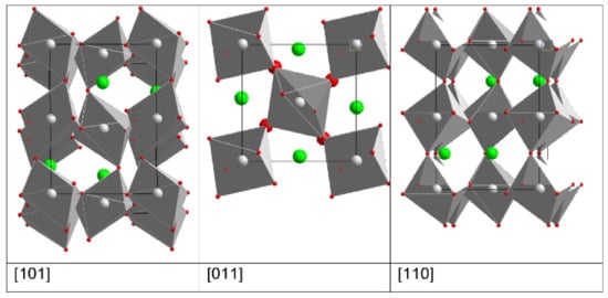 Today, there is increasing attention towards perovskite-type materials [1,2,3,4,5]. This is mainly due to their excellent properties and practical applications. Many of these materials have interesting properties such as ferroelectricity or ferromagnetism (used as sensors and data storage devices) [6], etc. Furthermore, they are used as supercapacitors for electrochemical energy storage (batteries and electrochemical capacitors) [7,8,9]. Some have successfully been used as perovskite solar cells (PVSCs) [10,11,12,13] due to their remarkable efficiency increase of nearly 24% compared to commercial Si solar cells [1], or ceramic foam membranes for oxygen [2] or carbon dioxide transport [14]. Others have been used as superior perovskite electrocatalysts [15], possessing multiferroic properties together with polarization-induced photoelectrochemical activity, for water splitting applications [16]; and as so-called oxygen carriers in energy-generation processes [17,18,19] due to the reversible and fast change of oxygen content for many cycles at high temperatures. When external conditions such as temperature or pressure are used, changes in their physical or structural properties are observed [12,20]. The perovskite structure is most commonly found for compounds with a general ABX3 formula. An A is commonly a metal with a +1 or +2 oxidation state, B is a metal with a +3, +4, or +5 oxidation state, while an X is an anion, most often an oxide or fluoride.