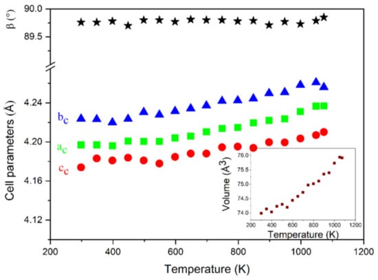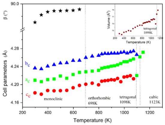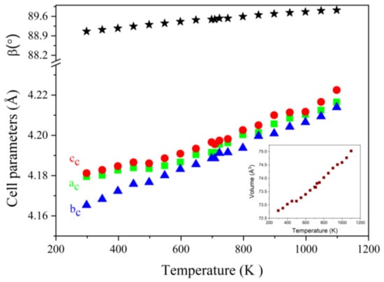Undoped SrPbO3 ceramic was exposed to high (from RT up to 1148 K) and low (from RT up to 14 K) temperatures. The temperature evolution of the selected diffraction lines is shown in Figure 3; it indicates the effect of temperature on the lattice parameters. The sample behavior is remarkable while processing at high temperatures. This behavior is opposite to the behavior of the previously examined oxide perovskite samples containing the PbO6 octahedral, i.e., BaPbO3 [20]. The temperature relationship of the SrPbO3 pseudocubic cell parameters is shown in Figure 7. It is clear that the cell parameters (ac, bc, cc, and β) change smoothly. In other words, they increase systematically with an increase in temperature up to 1093 K. The average error for cell parameters determination was ±0.0027 Å for a, b, and c; for β, it was ±0.05°; and for V, it was equal to ±0.07 Å3. Widely conducted temperature crystalline structure studies have shown that no structural phase transitions occurred between 298 K and 1093 K in the SrPbO3 sample. Instead of that, the continuous increase in cell parameters is accompanied by an increase in temperature (Figure 7). This is interesting since Keester et al. [37] reported observing an SPT, a tetragonal phase, that started at about 450 °C. For that reason, special attention was paid in this paper to the 700–770 K temperature range. An analysis of the line splitting showed the presence of three lines of {200}c and {220}c and two lines of {222}c at 723 K (Figure 3). This proves the monoclinic distortion of the perovskite cell. Therefore, this phase cannot be considered as a tetragonal phase since no evidence of the phase was observed. Furthermore, the continuation of high-temperature examinations (up to 1048 K) contradicts literature reports. The proof for this was the constant presence of three hh0 diffraction lines and two hhh lines. The linear change of the cell parameters (green squares, blue triangles, and red circles stand for ac, bc, cc, respectively) with increasing temperature was observed, with a clear demonstration that ac ≈ bc and their values were close to the cc values. The monoclinic angle (marked with stars). —β—tends to a value close to 90° Therefore, based on the observed behavior, a structural phase transition above the measured temperature of 1093 K can be expected. However, due to further heating, on the sample surface, Sr2PbO4 together with PbO was formed. Increasing the temperature inside the HT camera caused the progressive degradation of the sample, which was especially observed at 1148 K. Nevertheless, our study supported data provided by Hester [32], who observed a Pnma structure from 298 to 1033 K.