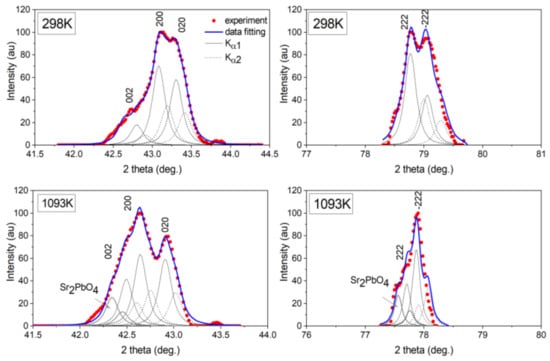 Now, it is interesting to evaluate how the substitution of Sr by Ba ions influences the crystal structure. The selected samples contain both (Ba0.2Sr0.8)PbO3 and (Ba0.3Sr0.7)PbO3 ceramics. As a result of doping with Ba2+ to SrPbO3, (Ba0.2Sr0.8)PbO3 samples were produced. The crystalline structure of the (Ba0.2Sr0.8)PbO3 compound was studied in a similar manner, using an undoped sample for the same set of diffraction lines. Therefore, Figure 9 shows the thermal evolution of certain {200}c and {222}c lines at selected temperatures, i.e., at 298 and 1093 K. The analysis of the data showed that the structure has a monoclinic distortion, which is similar to that observed for undoped SrPbO3. That conclusion is supported by the presence of three lines of the {200}c type, which exist together with two lines of the {222}c type.