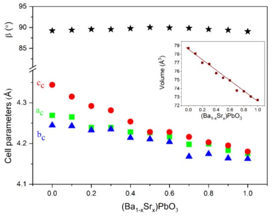 Analogously, the inlet in Figure 13 shows, that the volume of the pseudocubic cell changed linearly with the degree of substitution. The analysis of the XRD pattern at RT showed that the distortion for SrPbO3 was significantly bigger than that observed for BaPbO3, with middle values for intermediate compositions.