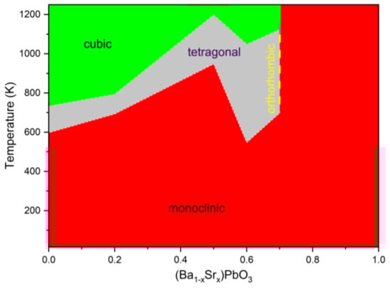 What is fundamental is that the XRD, together with SEM-EDS data, proved that it was possible to obtain good-quality monophase samples, which is in opposition to some previous reports [45]. Furthermore, it is also the first time that such a wide-temperature study has been carried out. The obtained results from X-ray powder diffraction measurements allowed us to prepare the phase diagram for (Ba1−xSrx)PbO3 samples, which is shown in Figure 14. In Figure 14, three regions, namely monoclinic (red area), tetragonal distortion (grey area), and cubic (green area), are marked. The phase diagram is built based on a careful investigation, covering temperatures in the 14–1148 K range and substitution levels from 0 to 1.0 in the (Ba1−xSrx)PbO3 system. Taken together, the data obtained in the presented work and the data obtained in the previous papers enabled us to build this diagram. Lower-temperature studies proved that the system exists as a monoclinic distortion of the perovskite cell in the whole substitution range. Moreover, at room temperature, all studied ceramics showed monoclinic distortion. It is clear that the monoclinic distortion is dominant when looking closely at the diagram. When the temperature increases, monoclinic-tetragonal phase transitions occur for substitutions of 0 to 0.7. For example, for parent ceramic BaPbO3, monoclinic distortion existed up to 598 K; for substituted (Ba0.8Sr0.2)PbO3, it existed up to 693 K; for (Ba0.5Sr0.5)PbO3 it was up to 948 K; and for (Ba0.4Sr0.6)PbO3 and (Ba0.3Sr0.7)PbO3 ceramics it was, respectively, 548 K and 1098 K. On this basis, it can be concluded that the temperature of the structural phase transition increases while increasing the amount of Sr2+ in the sample, except for in the (Ba0.4Sr0.6)PbO3 sample, which is not clear. The detected tetragonal phase (a grey area) is rather narrow for the system. Furthermore, similar behavior is also observed when the experimental temperature is increased, where the tetragonal-cubic transition occurs. For barium-rich samples such as BaPbO3 or (Ba0.8Sr0.2)PbO3, cubic phases exist as low as 733 K and 793 K. Cubic structure is observed for (Ba1−xSrx)PbO3 materials where x = 0–0.7. For ceramics with x > 0.7, no structural temperature-induced phase transitions are observed during pendant heating.