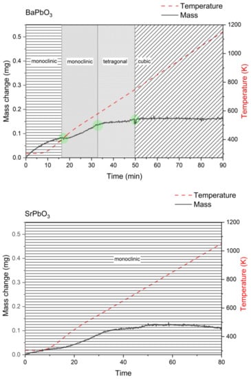 In Figure 15, simultaneous thermal analysis data are shown for selected perovskites of the (Ba1−xSrx)PbO3 system. A 5 mg sample was analyzed in each case within the conditions described in the experimental section. Figure 15a,b shows the experimental data for the two non-doped perovskites, i.e., BaPbO3 and SrPbO3, respectively. The mass changes of the samples were observed in the given regions where structural phase transitions appeared. It is clear to see small slopes in masses, shown in the circles, supporting SPT for BaPbO3. The existence of the phases, namely by the structural distortion of ideal perovskites, is shown by diverse fields with different patterns filled. However, it should be noted that there were no changes in temperature (DSC) observed while SPT occurred, nor when the initial mass of the sample was changed from 5 to 20 or 200 mg. Furthermore, when the structural phase transitions were not detected by XRD study, they were also not observed in STA examinations, as shown, for example, for the SrPbO3 material. The thermal analyzer used in this research was a valuable tool with great accuracy and sensitivity, enabling supporting observations from powder diffraction. As a consequence, this supplementary testing supported the XRD data and enabled the preparation of the phase diagram.