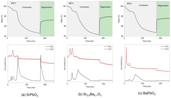 Due to the low melting temperature for the SrPbO3 sample, the combustion of the fuel was not performed effectively at some temperatures. For example, in Figure 16a, the high peak of CO2 is presented during regeneration, which means not all coal was combusted completely at 850 °C (1123 K). However, for BaPbO3, which is more thermally stable, total hard coal combustion was observed even as high 900 °C (1173 K) (Figure 16c). This is distinguished by elevated CO2 peaks during combustion and the lack of a CO2 peak in the regeneration stage. When barium was added to SrPbO3, an improvement in thermal stability and reactivity were observed (Figure 16b). The Ba0.9Sr0.1PbO3 might be indicated as the promising sample for CLC application. Consequently, the high content of barium increases the temperature resistivity; moreover, a small addition of strontium provides a beneficial reactivity rate. Therefore, the Sr-doped material showed the better performance with the Illinois#6 hard coal.