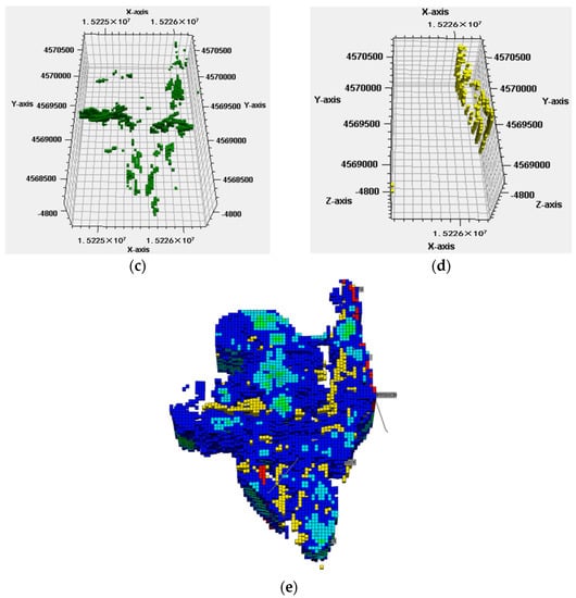 Reservoir distribution of the S91 unit. (a) Caves; (b) vugs; (c) fractures; (d) faults; (e) reservoir model of the S91 unit.