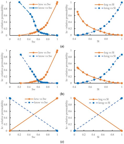 Relative permeability curves of the S91 unit reservoir. (a) Caves; (b) vugs; (c) fractures or faults.