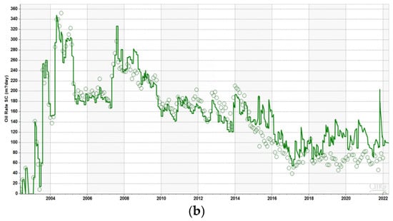 Liquid and oil velocity matching of the S91 unit in the initial model. (a) Liquid velocity; (b) oil velocity. (the circles represent actual production data, and the lines represent simulation results).
