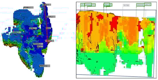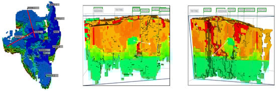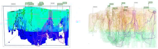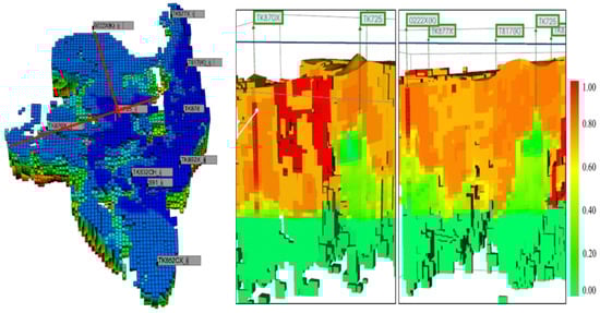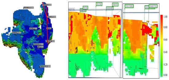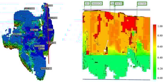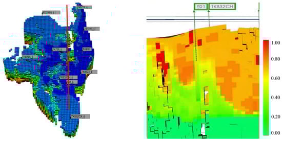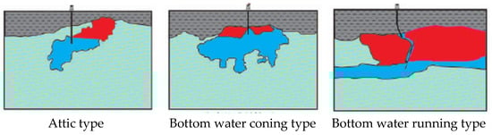 Regarding the bottom aquifer running residual oil type, some fractures connected with the deep bottom water were observed near the well bottom. The deep water flowed rapidly into the well bottom during the production process through the fractures under certain pressure differences. Because both the water in the fractures ran in with line type and the water was mainly produced after oil water flooding, a high residual oil amount was blocked by the bottom aquifer in the surrounding zones of the oil well and, consequently, could not be extracted directly. For instance, fractures with high angles in the reservoirs across the S91 resulted in high water flows, explaining the distribution of the residual oil around and in the upper part of the well, as shown in Figure 7.
