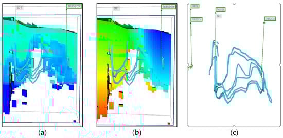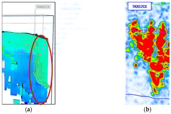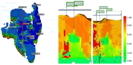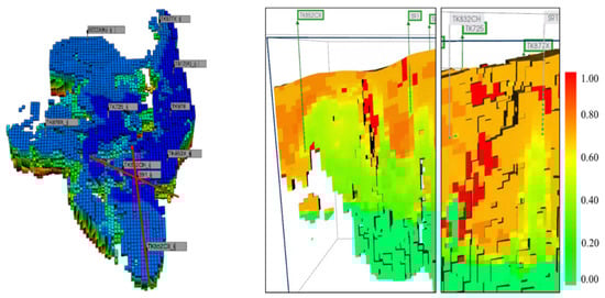 Figure 16 shows the water distribution and reservoir development around the TK817(K) well. The obtained results revealed complex reservoir development around the TK817(K) well, showing the presence of caves, vugs, and fractures and forming a water cone with the effects of bottom water coning and serious water flooding. In addition, obvious bottom water connections of the TH817(K) well with TK878, TK892X, TK877X, and TK725 were observed due to the flow direction of the injected water. Therefore, the connectivity between TK817(K) and surrounding wells was good.