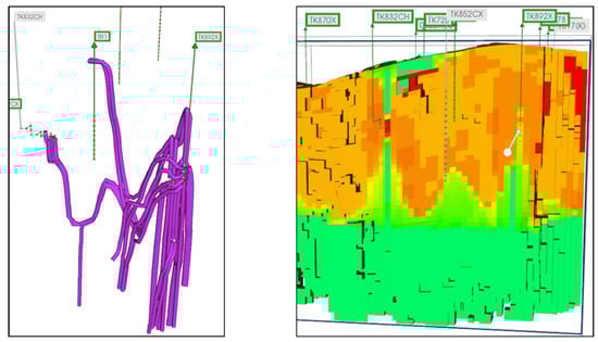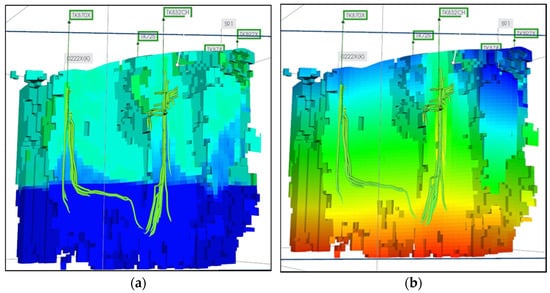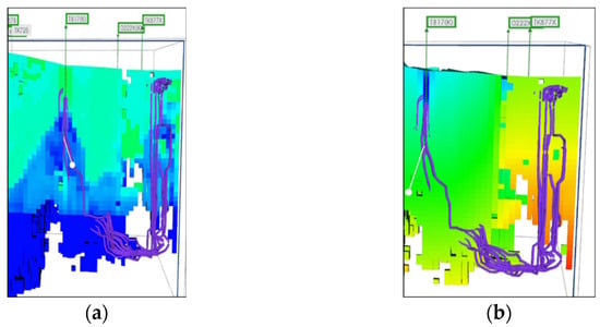 By simulating the streamline of the injected water, the flow direction of the injected water in the TK832CH well can be shown as in Figure 11. The simulation results indicated an occurrence of bottom water coning in the TK832CH well. In addition, the injected water in the TK832CH well was produced through the connection of the bottom water line from three wells, namely S91, TK870X, and TK892X.