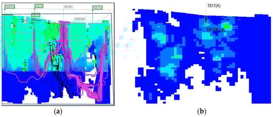 As shown in Figure 15, bottom water coning was serious in the TK877X well. In addition, the injected water flowed into the T817(K) well due to the connection of the bottom reservoirs. According to the reservoir pressure distribution, the bottom pressure of the TK877X well was higher, resulting in an effective driving pressure difference combined with the low-pressure area of the T817(K) well. According to the reservoir development, considerable vugs and fractures were observed in the TK877X-T817(K) areas, suggesting certain connectivity between TK877X and T817(K). In addition, faults near the TK877X well resulted in a vertical flow line across the TK877X well, as shown in Figure 15.