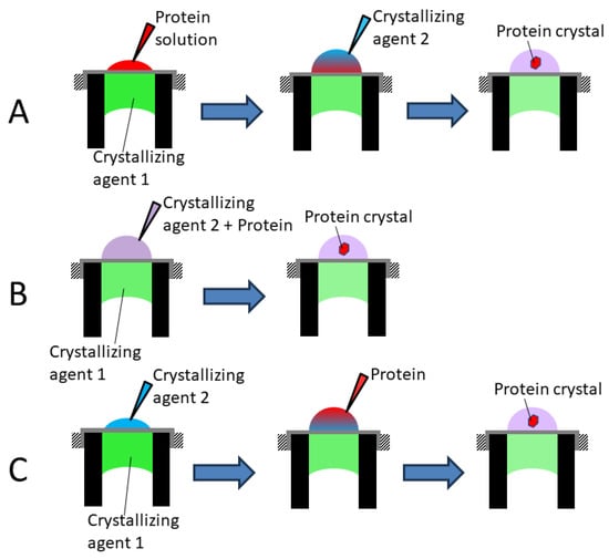 Sequence of events in protocol 1A (A), 1B (B) and 1C (C) used for protein crystallization.