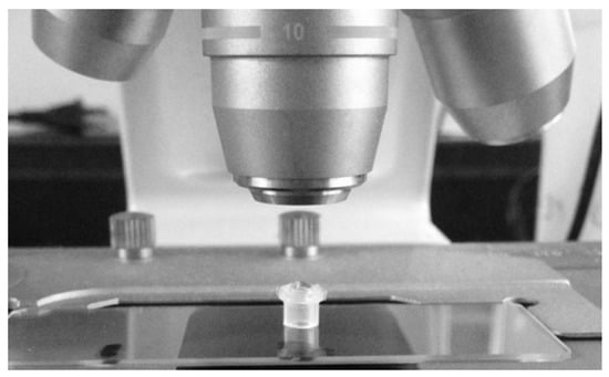 Figure showing micro-volume dialysis device on the stage of a light microscope.
