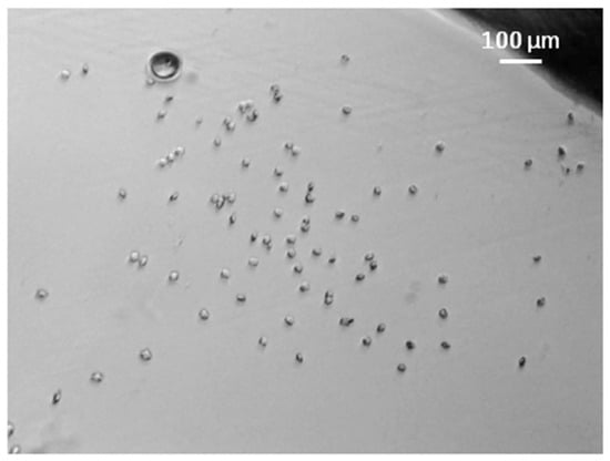 In order to test the hypothesis that rapid crystal formation using protocol 1A was due to concentration inhomogeneity and the resultant localized supersaturation, an experiment was carried out using protocol 1B. A 20 μL quantity of lysozyme solution was mixed with 20 μL of PEG solution in a microfuge tube. The space below the membrane of a micro-volume dialysis device was filled with 20 μL of sodium chloride solution. A 10 μL droplet of the pre-mixed lysozyme-PEG solution was placed on top of the dialysis membrane. In terms of the overall quantity of material used, this experiment was therefore equivalent to that carried out using protocol 1A with 20 μL of sodium chloride solution and 5 μL each of the protein and PEG solutions. The main difference was with concentration heterogeneity, which was greater in protocol 1A. In the experiment carried out using protocol 1B, specks indicative of crystal formation were observed within around 4 to 6 min, while clearly identifiable lysozyme crystals were observed only after 7–15 min. Figure 9 shows crystals obtained after 20 min. The number of crystals was significantly lower, and these were considerably smaller in size than those obtained using protocol 1A (see Figure 5B and Figure 9 for comparison). Additionally, there was considerable variability in results obtained with protocol 1B, unlike with protocol 1A, which was highly reproducible. In some instances, no crystals could be obtained using protocol 1B, while crystals were consistently obtained in nearly the same length of time with protocol 1A. The above results clearly show that rapid lysozyme crystal formation with protocol 1A was a result of the high degree of controlled heterogeneity of the concentration of the different species involved in the process.