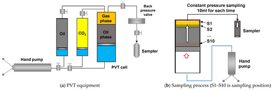 - Sampling for measuring the gas–oil ratio and oil and gas composition: a. The PVT cell was placed vertically, and the gas and oil in the cell were sampled at the top using a high-pressure bottle with an effective volume of 10 mL by pushing the piston up to keep the cell pressure constant; 10 samples were taken with an interval of 10 mL (as shown in Figure 1b); b. The sampling bottle was cooled down to room temperature, then the upper gas inside the bottle was released slowly while not taking away as much of the separated oil as possible; c. The volume of the released gas was measured using a gas flow meter with an accuracy of 0.001 L/min; the weight of the sampling bottle before and after sampling and after gas release was also measured using an electronic scale with an accuracy of 0.01 g. Then, the gas–oil ratio profile inside the cell from the top to the bottom was calculated based on the released gas volume and the crude oil mass before and after gas release. In addition, the compositions of the oil and gas sampled in the middle position of the gas and oil phase in the cell were analyzed using gas chromatography.