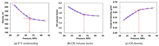 The P–V relationship and the calculated volume factors and densities of crude oil at 123.3 °C and different pressures are shown in Figure 2. The crude oil was prepared in terms of the gas–oil ratio of 274 m3/m3, and its saturation pressure was determined to be 32.75 MPa according to the turning point of the P–V relationship; this is consistent with the previous experimental result of 32.13 MPa. At the saturation pressure, the crude oil volume factor and density are 1.7433 and 0.6192 g/cm3, respectively. When the pressure is enhanced to the formation pressure of 35.75 MPa, the volume factor decreases to 1.7133, and the density increases to 0.6301 g/cm3. Hence, it can be seen that the crude oil of block B111 is characterized by a high gas–oil ratio, high saturation pressure, slight formation-saturation pressure difference, high volume factor and low density.