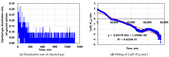 Under reservoir conditions, a certain amount of natural gas was injected into the PVT cell through the top inlet and dissolved and diffused downwards in the crude oil. The pressure drop of the cell and the calculated amount, dissolution rate and diffusion coefficient of the injected gas dissolved in crude oil are shown in Figure 3. The results show that the dissolution rate of the injected gas in crude oil was relatively large within the first 300 min, reaching 0.09–0.32 mL gas/mL oil/min. Cell pressure declined from 36.32 MPa to 31.12 MPa with a drop of 5.2 MPa. Then, cell pressure started to decrease slowly and reached stability 1440 min later. The pressure was kept at 30 MPa, and the total pressure drop was 6.32 MPa. The average dissolution amount of the injected gas in crude oil is 28.02 mL gas/mL oil, and the corresponding average diffusion coefficient of the injected gas in crude oil is 4.81 × 10−7 m2/s. Because the content of CH4 in the injected gas accounts for more than 90 mol%, the diffusion coefficient mainly reflects the diffusion ability of CH4 in crude oil. Generally, the gas diffusion coefficient in the oil or water phase is in the order of 10−9 m2/s. It can be seen that the injected natural gas has great diffusion ability in the crude oil of block B111 due to the high reservoir temperature and low oil viscosity, but the dissolution amount of the injected gas is relatively small because of the little formation–saturation pressure difference.