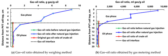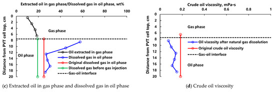 The miscibility–extraction effect of injected gas on crude oil can be analyzed according to the gas–oil ratio profile along the PVT cell. The gas–oil ratios of 10 samples taken in the cell from the top to the bottom are shown in Figure 4. For the convenience of comparison, the original gas–oil ratio of block B111 and the gas–oil ratio of the oil phase in the cell before natural gas was injected are also marked in the figures. The original gas–oil ratio of 274 m3/m3 is expressed as 0.333 g gas/g oil, 338.27 mL gas/t oil, or an associated gas content of 24.97 wt%. Before the natural gas was injected into the cell, the volume and pressure of the cell were 200 mL and 23 MPa, respectively. Part of the associated gas was separated from the crude oil and accumulated in the upper cell with a volume about 100 mL, which was also used for injected gas. The saturation pressure of crude oil is 32.13 MPa; hence, according to the law of partial pressure, the gas–oil ratio of the oil phase in the lower cell is only about 72% (23/32.13) of the original value, namely 0.239 g gas/g oil, 243.13 mL gas/t oil or 19.30 wt%. Accordingly, the measured gas–oil ratio profile in the cell was drawn in three types. The first one used the data obtained using the weighing method (Figure 4a); the second one used the data obtained using the gas metering method (Figure 4b); the third one was expressed as extracted oil in the gas phase and dissolved gas in the oil phase based on the data of the first one (Figure 4c).