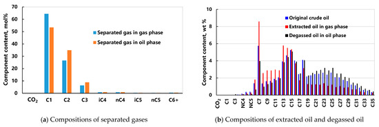 In addition, the compositions of the oil and gas samples obtained from the upper gas phase (at the position of 2.5 cm) and the lower oil phase (at the position of 10.5 cm) were analyzed; the results are shown in Figure 5. The CH4 content in the natural gas separated from the gas phase is 11% higher than that from the oil phase, and the natural gas separated from the oil phase contains more C2 and C3. Compared with the original crude oil composition (dead oil), the contents of medium and light components in the extracted oil in the gas phase increased, while those of the heavy components decreased. The content of C6–C15 in the extracted oil is significantly higher than that in the original crude oil, especially the content of C7 is the highest. Accordingly, the contents of medium and light components in the degassed oil in the oil phase decreased, and the contents of the heavy components increased with the content of components C17+ higher than that in the original crude oil. The effects of dissolution–diffusion and miscibility–extraction of natural gas on crude oil have an important influence on the compositions of both the gas and oil phases.