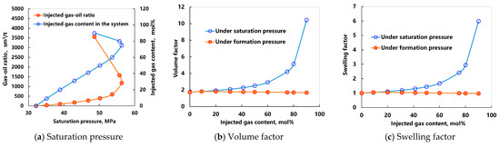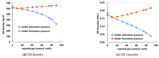 The calculated physical properties of the crude oil with different amounts of injected natural gas dissolved at saturation and formation pressures and 123.3 °C are shown in Figure 6. The results show that under the reservoir’s conditions (35.75 MPa, 123.3 °C), the saturated solubility of the injected natural gas in the crude oil is relatively small, only 9.1 mol% (i.e., 40 sm3/t dead oil). If the oil volume and expansion factors reach 1.81 and 1.06, respectively, the oil density will decrease from 628 kg/m3 to 609 kg/m3, and the oil viscosity will decrease from 0.1849 mPa·s to 0.1604 mPa·s. Hence, in this case, the swelling and viscosity-reduction effect of the injected natural gas on the crude oil is limited. When more injected natural gas is mixed with crude oil, the system will present a gas–oil two-phase state. When the content of injected natural gas in the system reaches 90 mol%, due to the extraction effect of the gas phase on the oil phase, the density and viscosity of the oil phase can be increased to 659.89 kg/m3 and 0.2162 mPa·s, respectively, and the oil volume and expansion factors are reduced to 1.67 and 0.97, respectively. If all the excess gas is dissolved into the crude oil by the increase in pressure, the oil saturation pressure will reach 56.33 MPa when the injected natural gas content in the system is 75 mol%. If the content of the injected natural gas continues to increase, the phase state of the system will transfer from oil to gas, and the saturation pressure will also change from the bubble point to the dew point. When the content of the injected natural gas reaches 90 mol%, the gas density and viscosity will decrease to 324.66 kg/m3 and 0.0392 mPa·s, respectively, while the volume and expansion factors will increase to 10.44 and 5.987, respectively, presenting the characteristics of condensate gas.
