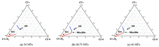MMP is an important parameter to judge the miscible state between injected gas and crude oil during gas flooding. Many methods can be used to determine the MMP of gas flooding, including the slim tube experiment, the interfacial tension test, EoS prediction and empirical formula calculation [25,26,27,28,29,30]. In this study, three methods were used to determine the MMP of natural gas flooding in block B111, including using the above established PVT model to predict the IFT between natural gas and crude oil; using the PVT model to simulate the multiple contact process; and using the empirical formula of Hou [27]. According to the predicted IFT, the MMP of natural gas flooding is 44 MPa, and the one-contact miscible pressure when the IFT disappears is 62 MPa (Figure 7). The MMP obtained by multiple contact simulation is 40.75 MPa (Figure 8), while the MMP predicted by Hou’s empirical formula is 42.42 MPa. These predicted MMPs are in a range of 40.75–44 MPa, which indicates that it is hard to reach a miscible flooding in block B111 under the original formation pressure, but it may reach near-miscible flooding or even miscible flooding depending on the formation pressure maintained.