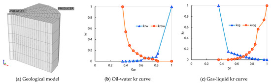 According to the reservoir conditions of block B111, a conceptual model was established using reservoir numerical simulation software to simulate and analyze the interaction characteristics of natural gas and crude oil during gas flooding. The main parameter setting in the basic model is shown in Table 4. In order to better describe the seepage and conveniently draw the fluid profile between the injection and the production wells, radial grids were used to describe the geological model, which is 90° fan-shaped with a radius of 250 m and a thickness of 5 m. The grid number is 20 × 5 × 5 = 500. The reservoir’s properties are homogeneous. The formation pressure and temperature are 35.75 MPa and 123 °C, respectively, while the formation porosity and permeability are 14.7% and 19.97 md, respectively, and the initial oil saturation is 0.64. The fluid model refers to the PVT model in Section 3.1, and the diffusion coefficient of CH4 in oil phase refers to the experimental result of 4.81 × 10−7 m2/s. The kr curves used are shown in Figure 9b,c. Moreover, one injection well and one production well are located in the geological model; their positions are shown in Figure 9a. The well spacing is 250 m. The underground gas injection rate is 4 m3/d, and the liquid production rate is the same with a bottom-hole pressure (BHP) of 15–45 MPa. Among them, 20 MPa and 35 MPa are typical values. The former is lower than the crude oil saturation pressure, and the latter is the original formation pressure. These two cases correspond to degassing production and pressure-holding production, respectively. The gas injection time is 30 years. The production performance and the oil and gas properties in the upper formation between injection and production wells were analyzed.
