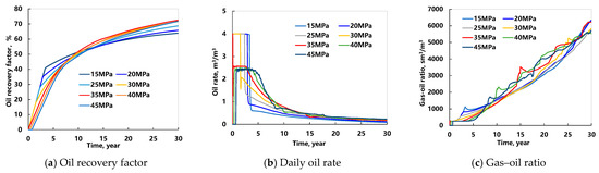 The production performances at different BHPs of the production well are shown in Figure 10. It can be seen that the smaller the production well’s bottom-hole flowing pressure, the longer the oil production rate is maintained at 4 m3/d; however, the earlier the gas channeling, the greater the decline of oil rate in the later production stage. When the BHP of the production well is 20 MPa, the crude oil in the formation near the production well will be degassed once production starts. As the oil degassing scope gradually expands, the injected natural gas and the separated gas from crude oil soon connect to form gas channeling. When the BHP of the production well is 35 MPa, it is necessary to inject natural gas to establish a large enough driving pressure difference between the injection and production wells. In this case, the gas drive’s front migration speed is relatively slower, the initial oil production rate is smaller, but the decline rate is also smaller, and the gas channeling occurs later. When the BHP of the production well is increased to 45 MPa, the natural gas injected in the early stage is used for enhancing the formation pressure. As a result, the gas channeling will be further delayed, but it will also cause the oil recovery to decrease a little. Overall, the oil recovery will be about 50% after 10 years of gas injection and reach 64–73% after 30 years. When the BHP exceeds 30 MPa, the final recovery rate is not much different. The production performance of near-miscible gas flooding can be achieved.