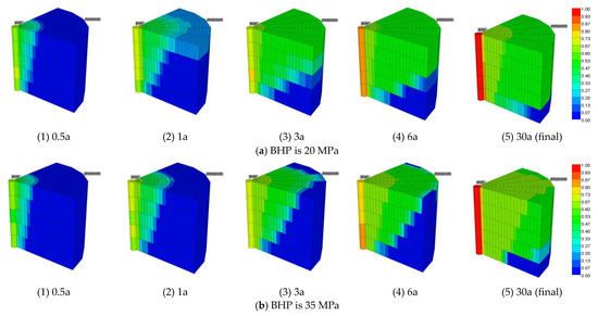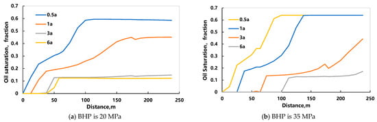 The variation in oil saturation in the top layer between the injection and production wells at different BHPs is shown in Figure 12. It can be seen that with the continuous injection of natural gas, the oil saturation between the injection and production wells will gradually decrease. The oil saturation at BHPs of 20 MPa and 35 MPa after the same gas injection time is different. When the BHP is 20 MPa, the migration speed of the gas drive front is faster due to the higher displacement pressure difference in the early stage and the lower formation pressure in the later stage. After a half year of gas injection, the gas drive front will advance 100 m and reach the production well after one year. The residual oil saturation near the injection well can reach 0 under the continuous extraction effect of injected natural gas. When the BHP is 35 MPa, due to a higher formation pressure maintained, more natural gas will dissolve in crude oil, and the gas drive front will reach the production well after 2–3 years of injection. Because of the stronger miscibility–extraction effect of natural gas, the oil displacement efficiency is higher, and the scope with residual oil saturation equal to 0 around the injection well is larger.