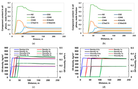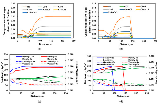 The gas phase density and viscosity after different years of injection are shown in Figure 14c,d. Generally, with medium and light components in the crude oil extracted by the injected natural gas, the gas phase density and viscosity will increase gradually. However, once the gas channeling occurs, as no medium and light components in the residual oil can be extracted, the density and viscosity of the gas phase will gradually decrease to the original values. When the BHP is 20 MPa, in the first 0.5–1 years of gas injection, the formation pressure is relatively large, hence the content of C2–C6 in the gas phase is also high. The density of the gas phase increases from 166–176 kg/m3 near the injection well to 224–235 kg/m3 near the production well. After 3–6 years of gas injection, as serious gas channeling occurs, the whole formation pressure drops to nearly 20 MPa, and the density of the gas phase decreases to 112–142 kg/m3. When the BHP is 35 MPa, the gas phase density is high, which gradually increases from 180 kg/m3 near the injection well to 242 kg/m3 near the production well. In addition, the gas phase viscosity is mainly affected by the formation pressure and less affected by the gas phase density. It decreases slightly from the injection well to production well, but the overall change is slight.