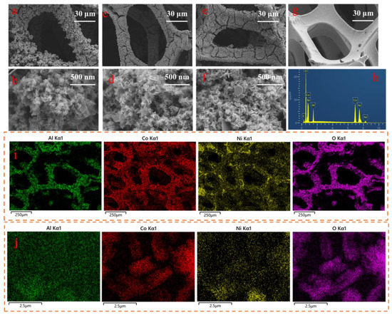 SEM images of (a,b) LDO/NF, (c,d) E1-LDO/NF, (e,f) E5-LDO/NF, (g) Ni foam, (h) EDX pattern of E5-LDO/NF, (i) EDS mapping of the E5-LDO/NF, and (j) EDS mapping of the E5-LDO.