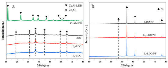 In this work, X-ray diffraction (XRD) patterns were used to investigate the composition and structural characteristics of the materials. Figure 2 shows the XRD spectra of CoAl-LDH, LDO and EX-LDO (X = 1, 5). Figure 2a presents a comparison of XRD patterns between CoAl-LDH and LDO prepared under different etching times. It can be observed that the diffraction peaks of CoAl-LDH at 11.5°, 23.5°, 34.8°, 39.4°, 46.6°, 56.2°, and 61.5° correspond to the (003), (006), (009), (015), (018), (110), and (113) planes, respectively [26,27,28]. These peaks indicate the typical layered double hydroxide (LDH) structure of the sample (JCPDS 51-0045). The XRD diffraction peaks of the precursor material, CoAl-LDH are consistent with the literature, confirming the successful synthesis of the precursor and the target product. The sharpness of the (003) and (006) diffraction peaks suggests the high crystallinity of the prepared CoAl-LDH [29,30]. By comparing the XRD patterns of the precursor CoAl-LDH and LDO and EX-LDO (X = 1, 5), significant changes in the crystal plane characteristics of CoAl-LDH can be observed. After calcination at 350 °C and etching treatment with NaOH solution, the XRD characteristic peaks of CoAl-LDH disappear, and the characteristic peaks of LDO are observed at 19.2°, 31.2°, 36.6°, 44.8°, 59.4°, and 65.1°, corresponding to the (011), (220), (311), (400), (511), and (440) planes of CoAl2O4 (JCPDS no. 38e0814), respectively. This indicates a significant phase transformation of CoAl-LDH during high-temperature treatment. The layered structure of CoAl-LDH is destroyed after calcination, resulting in a highly dispersed mixture of metal oxide. Figure 2b shows the XRD spectra of LDO/NF and EX-LDO/NF (X = 1, 5). For the bulk catalyst LDO/NF, the characteristic peak at 36.7° (311) can be attributed to NiO (JCPDS card No. 47-1049), while the peaks at 44.45° (111), 51.8° (200), and 76.3° (220) correspond to Ni [23,31]. No peaks from other phases were detected in both modes, indicating that the loaded LDO structure is not prominent. Additionally, in the XRD spectrum of E5-LDO/NF, the Ni characteristic peaks are stronger and have larger integrated areas compared to E5-LDO, indicating that extending the etching time exposes more active sites and can improve the crystallinity of other metal oxides on nickel foam.