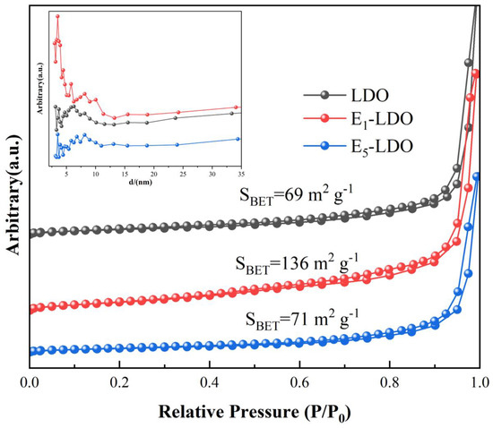 The N2 adsorption–desorption isotherms and pore size distributions of LDO and E1-LDO are shown in Figure 3, according to the standard of scientific papers. The isotherms are consistent with type IV isotherms and exhibit an H3 hysteresis loop (P/P0 > 0.4), indicating the formation of mesopores with a three-dimensional interconnected porous structure, which is beneficial for rapid mass transfer [28,32,33]. The specific surface areas of both catalysts can be calculated from the N2 desorption isotherms using the BET method. The specific surface area of E1-LDO (136 m2 g−1) is significantly larger than that of LDO (69 m2 g−1). E1-LDO possesses more active sites than LDO, suggesting that the etching effect of NaOH results in a higher specific surface area for E1-LDO. The pore size distribution reveals that E1-LDO with a diameter of 3–7 nm has a narrower pore size distribution compared to LDO with a diameter of 3–10 nm. The larger specific surface area and uniform porous structure provide more active sites and facilitate the adsorption of reactants, which is advantageous for excellent catalytic performance. However, the specific surface area of E5-LDO (71 m2 g−1) is not significantly different from that of LDO (69 m2 g−1). However, the catalytic activity of E5-LDO is much higher than that of LDO, indicating that the specific surface area is not the primary factor affecting the catalytic performance of the catalyst for formaldehyde oxidation.