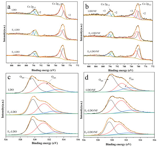 XPS spectra of the (a) Co 2p core level of LDO and EX-LDO (X = 1, 5); (b) Co 2p core level of LDO/NF and EX-LDO/NF (X = 1, 5); (c) O1s core level of LDO and EX-LDO (X = 1, 5); and (d) O1s core level of LDO/NF and EX-LDO/NF (X = 1, 5).