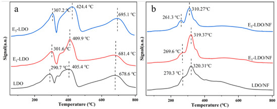 H2-TPR patterns of (a) LDO and EX-LDO (X = 1, 5) and (b) LDO/NF and EX-LDO/NF (X = 1, 5).