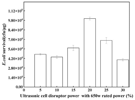 The first issue regarding ultrasound-mediated transformation is power. Although ultrasound can instantly enhance cell membrane permeability and promote the entry of foreign genes/drugs into cells (in a biophysical process called the sonic effect), energy overload from sound waves can also cause cell damage, and this phenomenon was first recorded in a study by Harvery on Bacillus in 1929 []. Thus, the supply of energy needs to be controlled in subsequent studies [,]. Therefore, using an ultrasonic application time of 9 s (working, 1 s; pause, 2 s), the ultrasonic power was set at 1%, 5%, 10%, 15%, 20%, and 30% of the rated power (650 W) (Figure 2). As shown in Figure 2, 20% of the rated power was optimal. The possible reason for this phenomenon is that the cell aperture formed by too little power is not enough to allow the plasmid to enter the cell, while too much power leads to local energy overload and, thus, to cell damage. Not only that, but ultrasound may also have a heating effect, so, experimental operations performed by physical methods often require an ice bath environment. But even then, this still causes local overheating and cell death, and Song et al. realized this in simulated temperature and power equations when studying ultrasound-mediated bacterial DNA transformation [].
