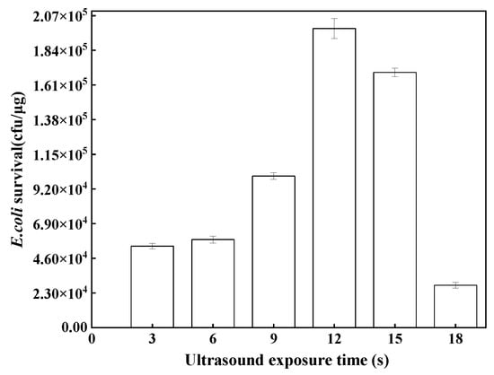 The total energy input received by the cell is not only related to the power input, but also to the ultrasonic application time. In microbubble-assisted ultrasonic penetration, as Ferrara et al. reported [], by controlling the ultrasonic application time, the microbubble pulsation (corresponding to stable cavitation) can be controlled in order to generate the mechanical force required to puncture the membrane while avoiding microbubble rupture (corresponding to inertial cavitation). In the microbubble-free ultrasonic-assisted penetration of bacteria, the mechanical pressure caused by ultrasound directly acts on the cell membrane. Therefore, under the optimal power of 20% of the rated power, ultrasonic application times of 3, 6, 9, 12, 15, and 18 s were assessed (Figure 3). As shown in Figure 3, 12 s was the optimal time. For application times shorter than 12 s, due to the existence of resistance screening (Ampr), the pores caused by ultrasound were not enough for a large number of plasmids to enter, and the survival rate of E. coli was not high. For application times longer than 12 s, possibly due to the mechanical pressure caused by the ultrasound, cells were overloaded and damaged. Therefore, a balanced critical point (12 s) was used to maximize the conversion efficiency.