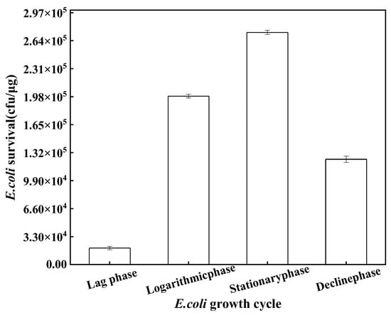 The microorganism growth phase is also important for the preparation of receptive cells; for example, for chemical transformation, the receptive cells need to be at the logarithmic phase which may be more receptive to foreign DNA []. To determine whether different growth phases of E. coli have similar effects on ultrasound-mediated transformation, E. coli in four phases (lag, logarithmic, stationary, and decline phases) were assessed (Figure 4). As shown in Figure 4, the stationary phase was optimal. Zinser and Kolter reviewed the evolution of E. coli during the stationary phase, and pointed that evolution during stationary phase is a continuous process, as the populations are repeatedly taken over by mutants of increased fitness throughout the stationary phase period []. So, the reason for this phenomenon may be that cell growth in the stationary phase is relatively adaptable and stable, and the ultrasonic energy received is relatively average.