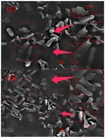 Ultrasound-mediated drug/gene delivery into cells involves the cavitation phenomenon []. Newman and Bettinger showed that ultrasound exposure in the presence of microbubbles can form, for a short time, pores in the plasma membrane up to 100 nm, which is associated with acoustic cavitation []. However, it has not been accurately verified whether ultrasound-mediated transformation of microorganisms (microbubble-free) also involves this cavitation phenomenon. Thus, in the subsequent study of ultrasonic transformation, researchers are also completely in accordance with the mechanism of analysis. Song et al. reported that Ca2+ has a promoting effect on ultrasound-mediated transformation, so the team based their theory on the cavitation effect to speculate about the mechanism []. In order to compensate for and confirm the cavitation phenomenon of ultrasound-mediated transformation in microorganisms (microbubble-free), in this study, under the optimal ultrasound-mediated transformation conditions, the mechanism was observed by timely freezing of the microorganisms and employing electron microscopy (Figure 6A–D). As shown in Figure 6A, normal E. coli has an intact rod shape. After long-duration high-power ultrasound, the cells were completely broken; only cell fragments could be seen using electron microscopy (Figure 6B). When the power and time were reduced to their optimal values (stationary phase, 20% of the rated power, application time of 12 s (working, 1 s; pause, 2 s)), the cells’ integrity was maintained; in this case, a single pore appeared in each cell, through which plasmids could enter the cell (Figure 6C). But, unfortunately, we did not observe multiple pores on the surface of a cell, which may be because the appearance of multiple pores enables the ease of connection between pores, resulting in cell fragmentation. For this reason, the mechanism of sonophoresis with low-frequency ultrasound is actually due to cavitational effects. However, under the same scanning electron microscope magnification (3 µm, 20,000×), it could be seen that the volume of E. coli after ultrasound-mediated transformation was enlarged (Figure 6A,C). As shown in Figure 6A, the length of normal cells is 1–1.4 µm, and the width is 0.2–0.25 (µm). Under the influence of ultrasound, the length of cells is 1.5–1.6 (µm), the maximum reaches 2.2 µm, and the width becomes 0.4–0.5 (µm). Pores of different sizes appeared on the cell surface, most of which were between 0.1 µm and 0.3 µm. After resuscitation culture, the length and width of the cells returned to normal levels again. This phenomenon has not been previously reported in the literature and, of course, this is for E. coli (microbubble-free). This may be due to the effects of ultrasound; in the absence of microbubbles, the entire cell cavity is used as a receptor for ultrasound and causes the cell to expand. From this, it can be concluded that the ultrasound-mediated transformation is mainly due to the cavitation phenomenon, just as Juan et al. reported, i.e., that cavitation is responsible for gene transfer, because transformation efficiency increased as bubble collapse was enhanced by exposing bacteria to tandem shock waves []. Loske et al. also reported that a preceding shock wave delivered 750 µs prior to a second pulse produced intensified cavitation and higher membrane permeabilization []. However, in-depth investigation into ultrasound-mediated transformation of E. coli (microbubble-free) in this paper showed that there is a difference between cells with or without microbubbles. This is the first time that the phenomenon of ultrasound-mediated microbial (microbubble-free) transformation has been reported using scanning electron microscopy.
