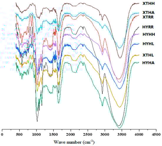 Infrared spectra of rice after different treatments. Xiantao raw rice (XTRR), Heyuan raw rice (HYRR), Xiantao rice cooked at high temperature and low pressure using plasma equipment (XTHL), Heyuan rice cooked at high temperature and low pressure using plasma equipment (HYHL), Xiantao rice cooked at high-temperature atmospheric pressure using a household cooker (XTHA), Heyuan rice cooked at high-temperature atmospheric pressure using a household cooker (HYHA), Xiantao rice cooked at high pressure and high temperature (XTHH), and Heyuan rice cooked at high pressure and high temperature (HYHH).