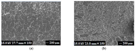 The microstructure of the rice surface after the high-temperature and low-pressure plasma treatment is shown in Figure 2. As can be clearly seen from Figure 2, cracks and dents on the surface of the rice particles after the high-temperature and low-pressure plasma treatment could have been caused by high-energy particles produced by the plasma during cooking. A large number of high-energy particles constantly impacted the surface of the rice, reducing the surface smoothness, changing the physical structure of the surface, and increasing the roughness, so that water could easily enter the inside of the rice, which is beneficial during rice cooking for the improvement of rice quality.
