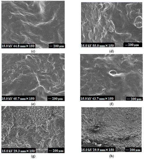 (a,c,e,g) Electron microscopic images of HYRR, HYHA, HYHH, and HYHL; (b,d,f,h) electron microscopic images of XTRR, XTHA, XTHH, and XTHL. The samples were tested under the conditions of 200 times amplification. Xiantao raw rice (XTRR), Heyuan raw rice (HYRR), Xiantao rice cooked at high temperature and low pressure using plasma equipment (XTHL), Heyuan rice cooked at high temperature and low pressure using plasma equipment (HYHL), Xiantao rice cooked at high-temperature atmospheric pressure using a household cooker (XTHA), Heyuan rice cooked at high-temperature atmospheric pressure using a household cooker (HYHA), Xiantao rice cooked at high pressure and high temperature (XTHH), and Heyuan rice cooked at high pressure and high temperature (HYHH). Different lowercase letters indicate significant differences between treatments (p < 0.05).