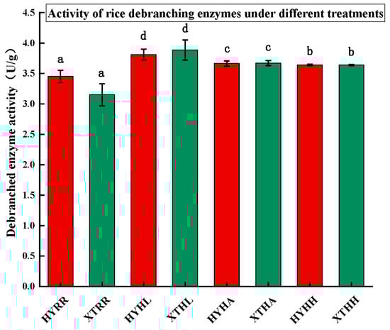 Activity of rice debranching enzymes under different treatments. Xiantao raw rice (XTRR), Heyuan raw rice (HYRR), Xiantao rice cooked at high temperature and low pressure using plasma equipment (XTHL), Heyuan rice cooked at high temperature and low pressure using plasma equipment (HYHL), Xiantao rice cooked at high-temperature atmospheric pressure using a household cooker (XTHA), Heyuan rice cooked at high-temperature atmospheric pressure using a household cooker (HYHA), Xiantao rice cooked at high pressure and high temperature (XTHH), and Heyuan rice cooked at high pressure and high temperature (HYHH). Different lowercase letters indicate significant differences between treatments (p < 0.05). The two rice groups were compared separately.