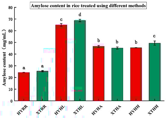 Amylose content in rice treated using different methods. Xiantao raw rice (XTRR), Heyuan raw rice (HYRR), Xiantao rice cooked at high temperature and low pressure using plasma equipment (XTHL), Heyuan rice cooked at high temperature and low pressure using plasma equipment (HYHL), Xiantao rice cooked at high-temperature atmospheric pressure using a household cooker (XTHA), Heyuan rice cooked at high-temperature atmospheric pressure using a household cooker (HYHA), Xiantao rice cooked at high pressure and high temperature (XTHH), and Heyuan rice cooked at high pressure and high temperature (HYHH). Different lowercase letters indicate significant differences between treatments (p < 0.05). The two rice groups were compared separately.