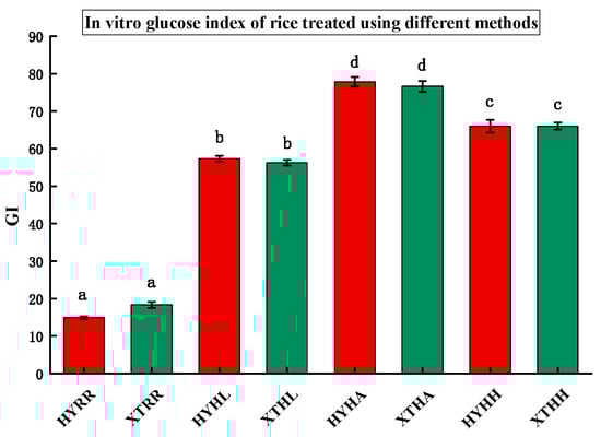 In vitro glucose index of rice treated using different methods. Xiantao raw rice (XTRR), Heyuan raw rice (HYRR), Xiantao rice cooked at high temperature and low pressure using plasma equipment (XTHL), Heyuan rice cooked at high temperature and low pressure using plasma equipment (HYHL), Xiantao rice cooked at high-temperature atmospheric pressure using a household cooker (XTHA), Heyuan rice cooked at high-temperature atmospheric pressure using a household cooker (HYHA), Xiantao rice cooked at high pressure and high temperature (XTHH), and Heyuan rice cooked at high pressure and high temperature (HYHH). Different lowercase letters indicate significant differences between treatments (p < 0.05). The two rice groups were compared separately.