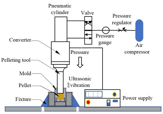 To produce high-quality pellets, the temperature range used was 90–140 °C, with the corresponding moisture content of raw materials ranging from 6% to 14% and pressure levels between 90–110 MPa [,,]. They were also highly energy-consuming processes that led to severe abrasion of the mold. To reduce both abrasion and energy consumption, comminution and adhesives have traditionally been widely used. Comminution aims to increase the flow and filling characteristics of raw materials by crushing straw into fine particles, increasing specific surface area, and destroying crystalline structures [,]. With the addition of adhesives such as pea and soybean waste, pellet durability and combustion characteristics have been improved []. In addition to the aforementioned pretreatment methods, alkaline solution [,,,], acid solution [,], organic solvent [], hydrothermal pretreatment [], and steam explosion [] are often used to separate lignin, hemicellulose, and cellulose. However, those methods mostly focus on the content of sugar or volatile fatty acids in the liquid phase for production of bioethanol or methane. Ultrasonic vibration-assisted (UV-A) pelleting employs a converter to transform the high-frequency oscillation signal from the ultrasonic generator into high-frequency mechanical vibration. The pelleting tool harnesses this energy to compress biomass, while avoiding the use of high temperature, pressure, and adhesives [,,] that are typically associated with traditional pelleting methods.
