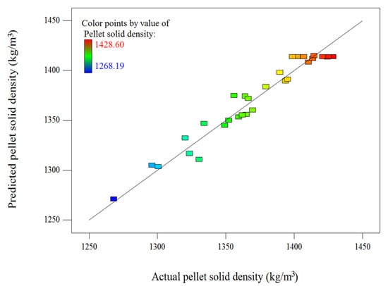 As listed in Table 3, the ANOVA indicated that the density model was highly significant (p < 0.0001) and the lack-of-fit test was insignificant. The coefficient of determination (R2), Adj-R2, and pred-R2 were 0.9491, 0.9016, and 0.7736, respectively. The values of coefficient of variation (C.V.) and Adeq Precision (AP) obtained herein were 0.97% and 15.36, demonstrating that the model was well fitted with the experimental data. Comparison between the actual numerical values and the predicted values for the density (Figure 3) further confirmed that this quadratic regression model for pellet solid density was reliable and accurate. The p-values of variables suggested that x2, x3, x4, x2x3, x3x4, , , and  had the most significant effects on density, followed by x1. After removing the statistically insignificant items in which the p-value exceeded 0.05, the response surface model for pellet solid density was formulated as Equation (3):