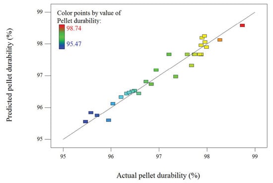 The ANOVA from Table 4 indicated that the durability model was extremely significant (p < 0.0001) and the lack-of-fit test was insignificant (p > 0.05). The coefficient of determination (R2), Adj-R2, and pred-R2 were 0.9483, 0.9001, and 0.7590, respectively. The values of the coefficient of variation (C.V.) and Adeq Precision (AP) obtained herein were 0.29% and 15.07, respectively; these suggest that the durability data were consistent with the second-order polynomial response surface model. To further validate the accuracy of the model, a comparison between the actual numerical values and the predicted values for the durability was carried out, shown in Figure 4. The points were uniformly distributed around the diagonal line. It can be considered that the response surface model could provide reasonable predictions for pellet durability.
