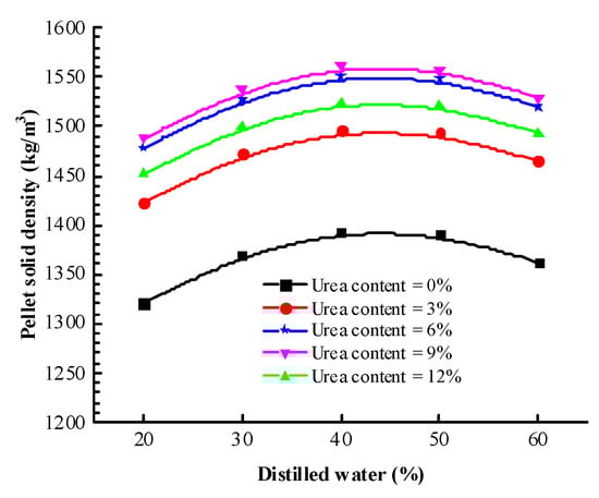 Equation (3) was utilized to predict the impact of distilled water on pellet solid density, and the results are illustrated in Figure 5. The pellet solid density increased with an increase in distilled water up to 40% under identical urea content but gradually decreased thereafter. Furthermore, an increase in urea content from 0% to 9% resulted in a corresponding increase in pellet solid density; however, at 12%, it was lower than that at 9%. It can be concluded that for urea with little distilled water, it was difficult to reach homogeneous mixing with raw corn stover, despite sufficient stirring. Minimal ammonia gas was converted from the urea solution, making it difficult to completely disrupt the chemical linkages between lignin and hemicellulose. This resulted in a reduced surface area of raw materials. However, excess distilled water diluted the concentration of urea solution and lowered the solid loading. Previous studies had shown that the low solid loading had a negative impact on ammonia gas conversion from urea [].