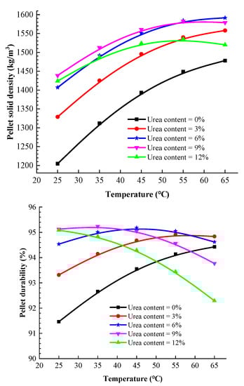 The effects of urea content on pellet solid density and durability (distilled water = 40%; temperature = 45 °C).