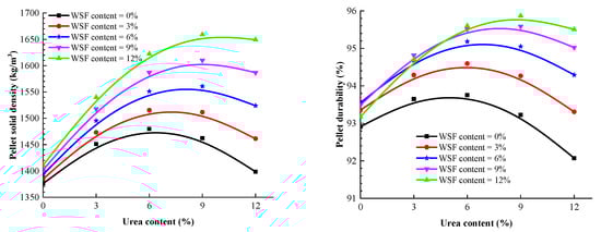 The effects of WSF content on pellet solid density and durability (distilled water = 40%; urea content = 6%).