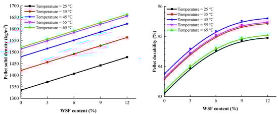 Equations (3) and (4) were used to predict the effects of WSF content on pellet solid density and durability, which are depicted in Figure 8. A linear relationship between pellet solid density and WSF content was observed, while the increase in pellet durability slowed down after reaching 9%. The effect of WSF content on pellet solid density was stronger than that on pellet durability. An increase in WSF content led to a rise in the amounts of additives present in corn stover. Kaliyan et al. [] reported that highly polar components, such as lignin, starch, and protein, could enable hydrogen bonding and solid bridges. The high temperature increased the activation energy of the reaction system, intensified the activity of OH−, and raised the possibility of breaking the cross-linking bond between lignin and hemicellulose.